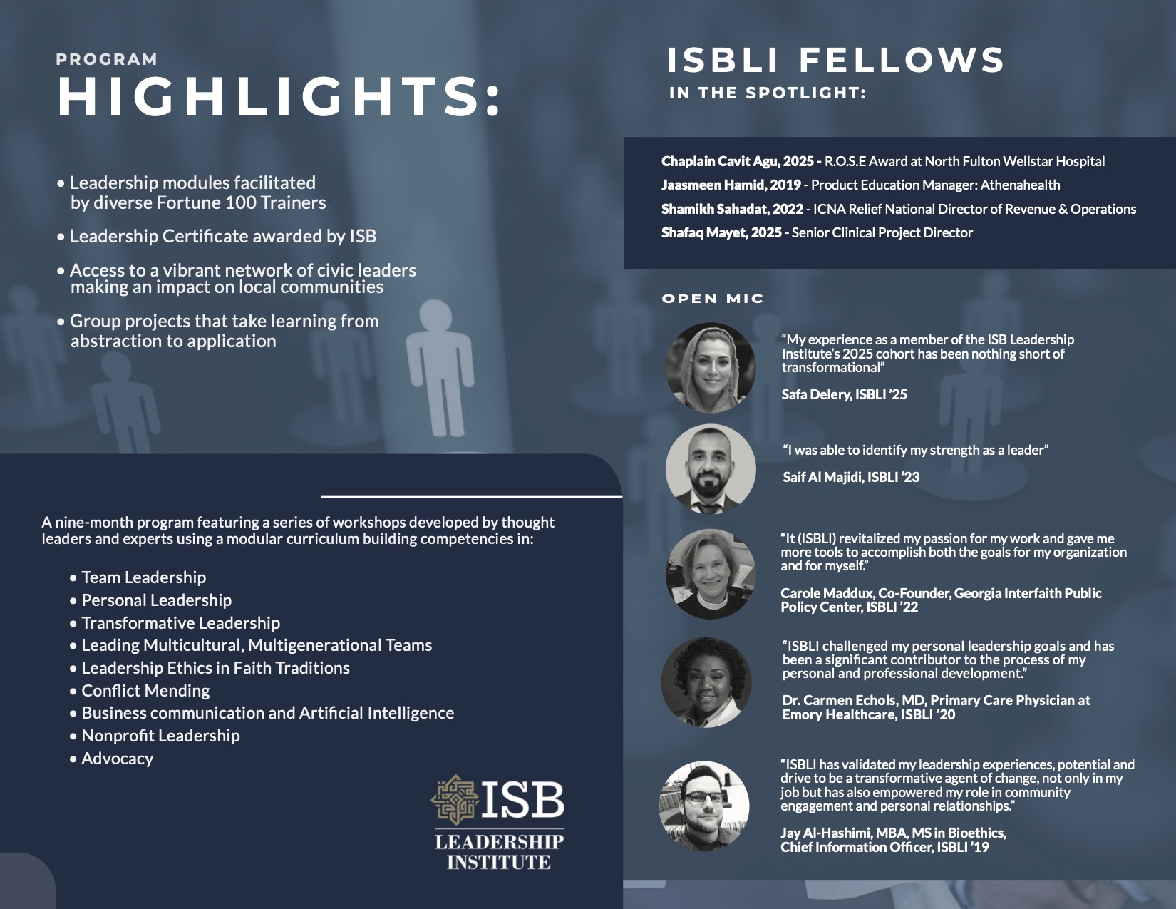 The ISB Leadership Institute (ISBLI) is an initiative of the ISB Atlanta geared to cultivate leaders with a purpose. ISBLI educates and prepares professional and community leaders who are committed to shaping a better collective future.