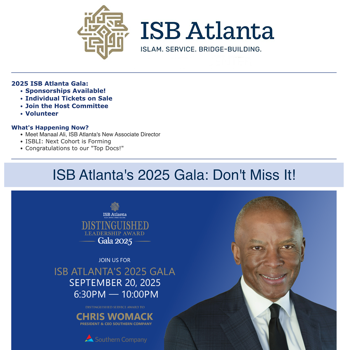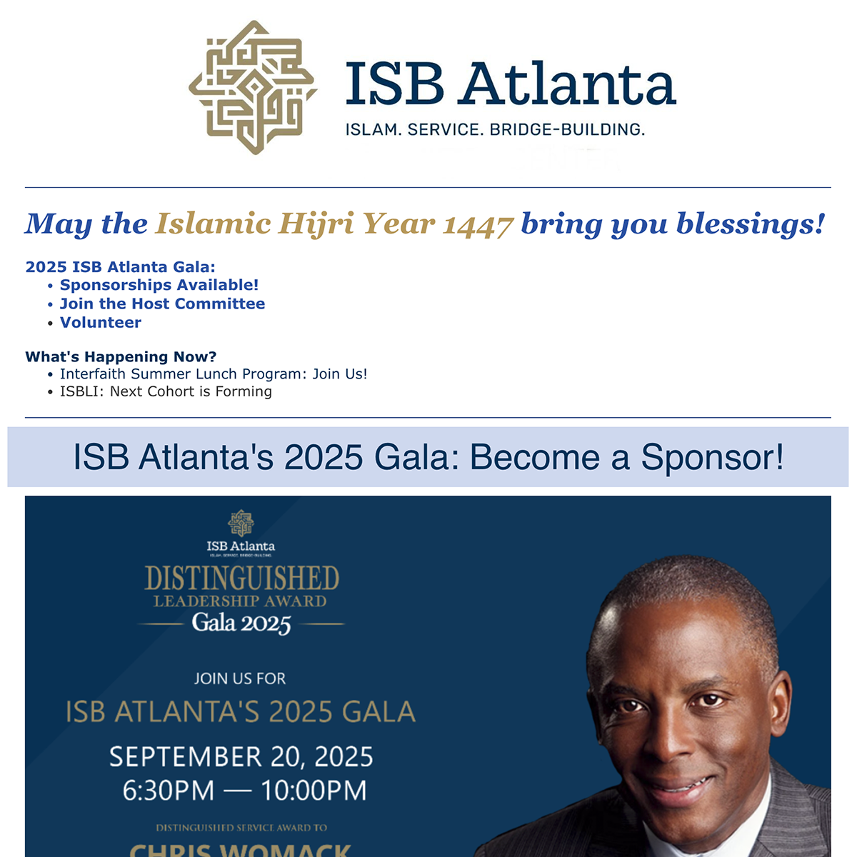Start the Islamic New Year with blessings and inspiration from ISB–Atlanta! In this issue, we reflect on the significance of 1447 AH and invite you to our 2025 Gala on September 20, where over 500 community leaders will gather to celebrate Muslim contributions and honor Southern Company CEO Chris Womack with the Distinguished Leadership Award. Join us in supporting ISB–Atlanta’s mission to build bridges through education, dialogue, and civic engagement.